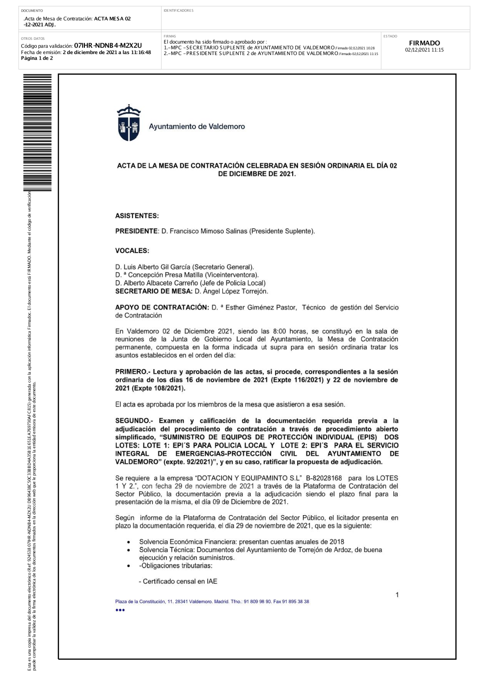 En esta sección puede acceder a los ficheros correspondientes a las actas firmadas de de mesas de contratación del Ayuntamiento de Valdemoro.