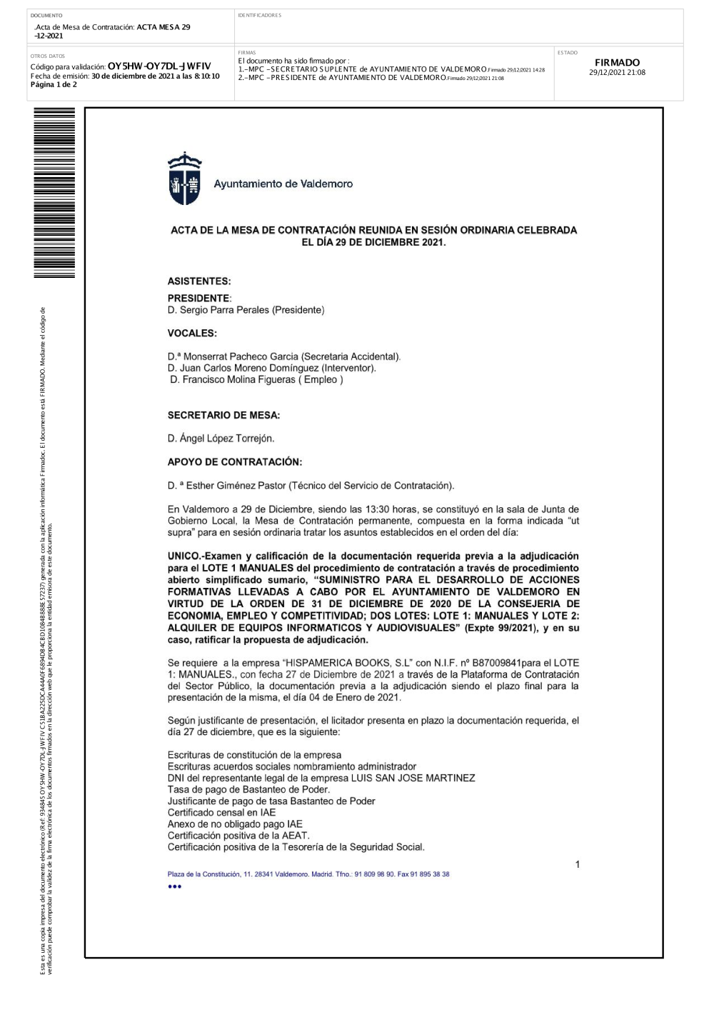 En esta sección puede acceder a los ficheros correspondientes a las actas firmadas de de mesas de contratación del Ayuntamiento de Valdemoro.