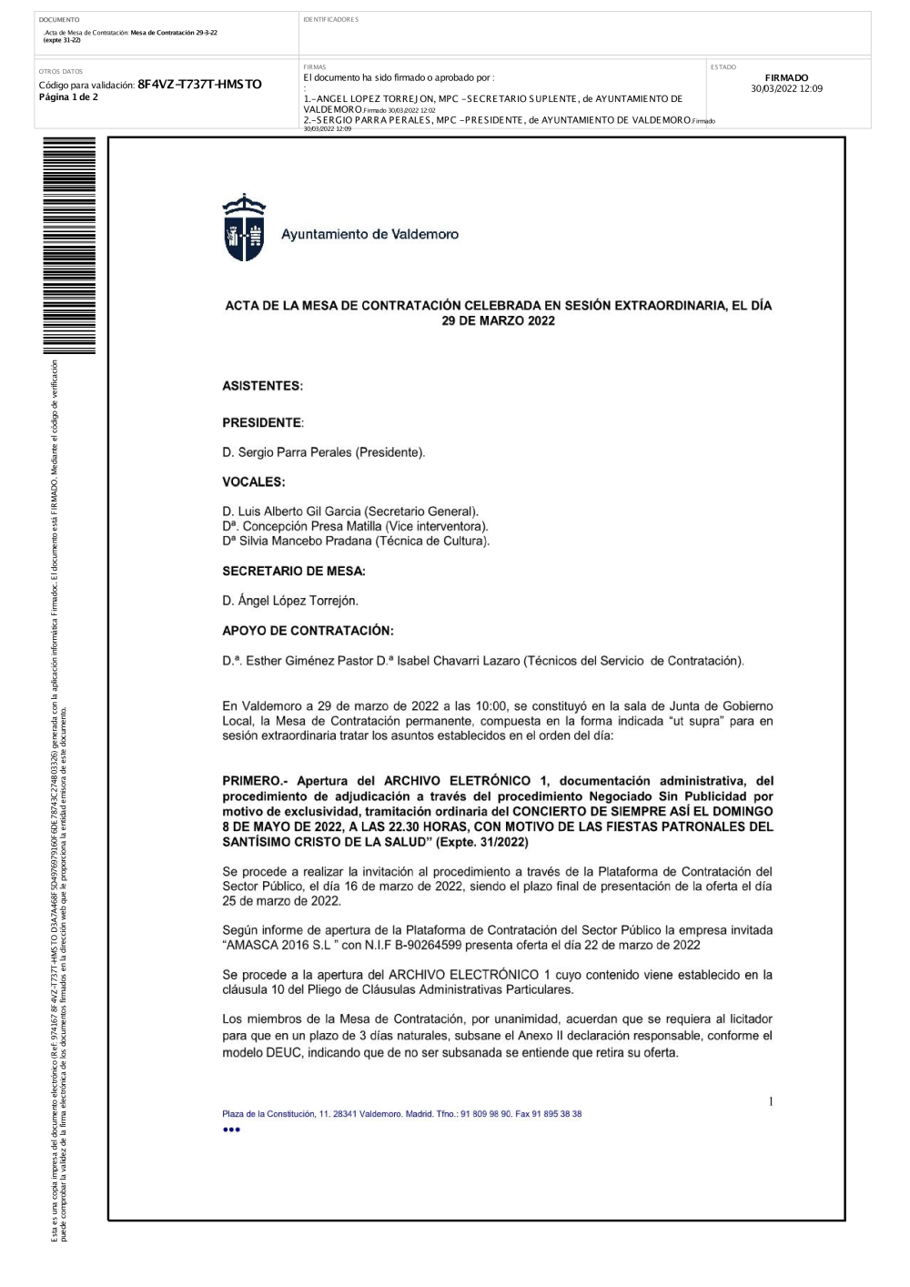 En esta sección puede acceder a los ficheros correspondientes a las actas firmadas de de mesas de contratación del Ayuntamiento de Valdemoro.