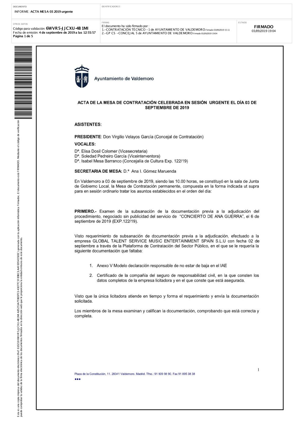 En esta sección puede acceder a los ficheros correspondientes a las actas firmadas de de mesas de contratación del Ayuntamiento de Valdemoro.
