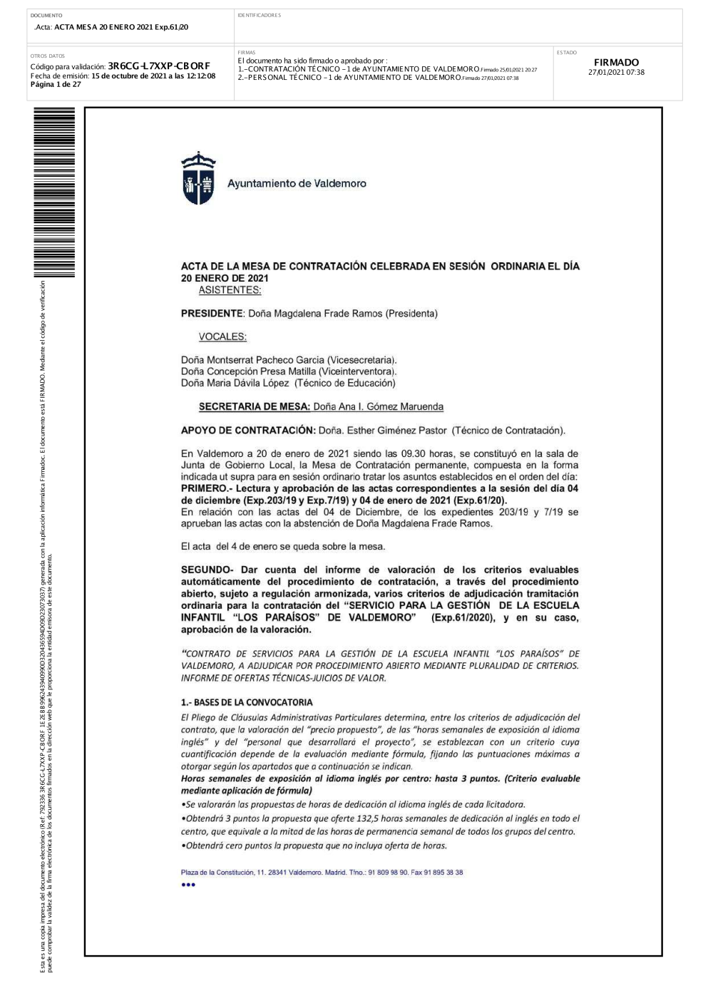En esta sección puede acceder a los ficheros correspondientes a las actas firmadas de de mesas de contratación del Ayuntamiento de Valdemoro.