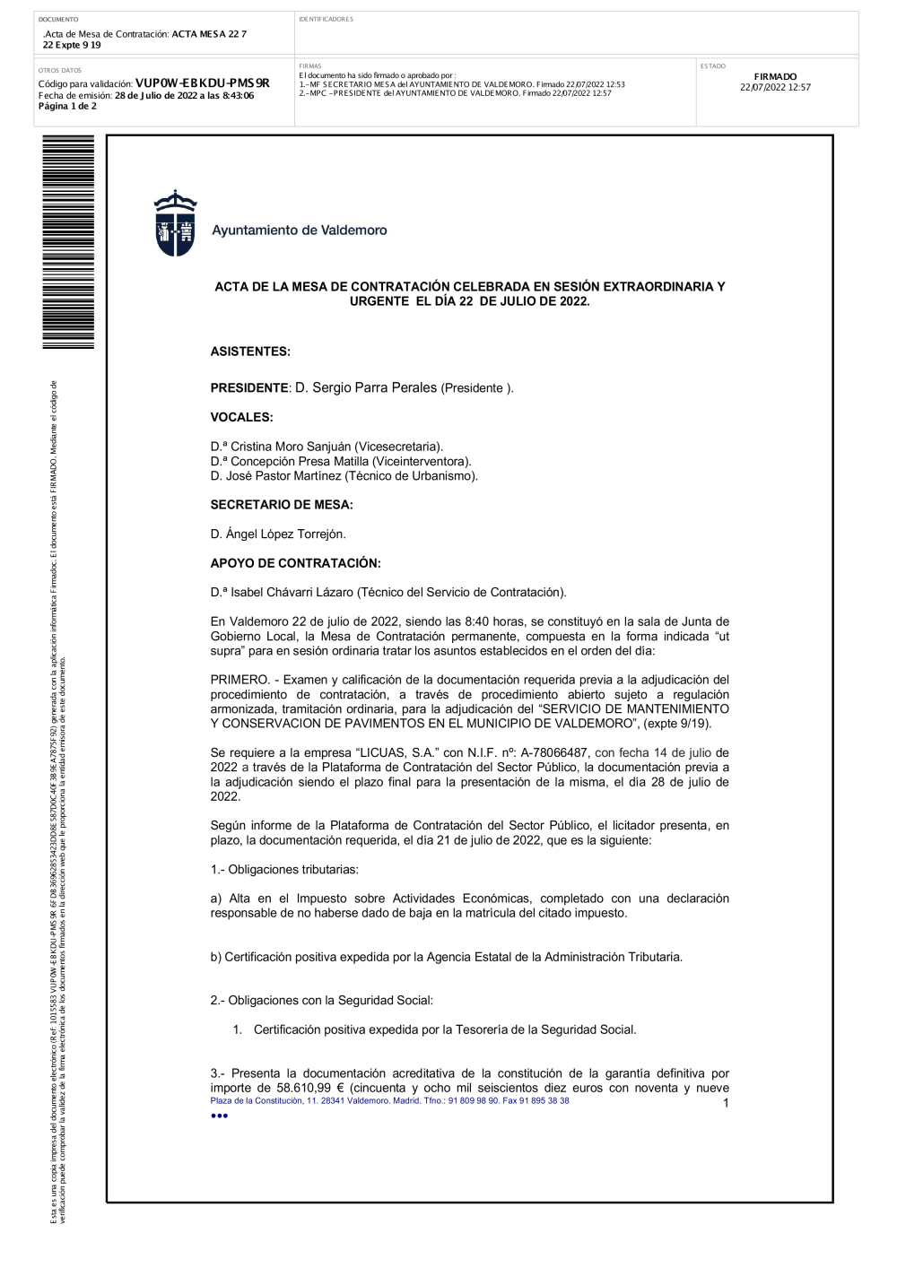 En esta sección puede acceder a los ficheros correspondientes a las actas firmadas de de mesas de contratación del Ayuntamiento de Valdemoro.