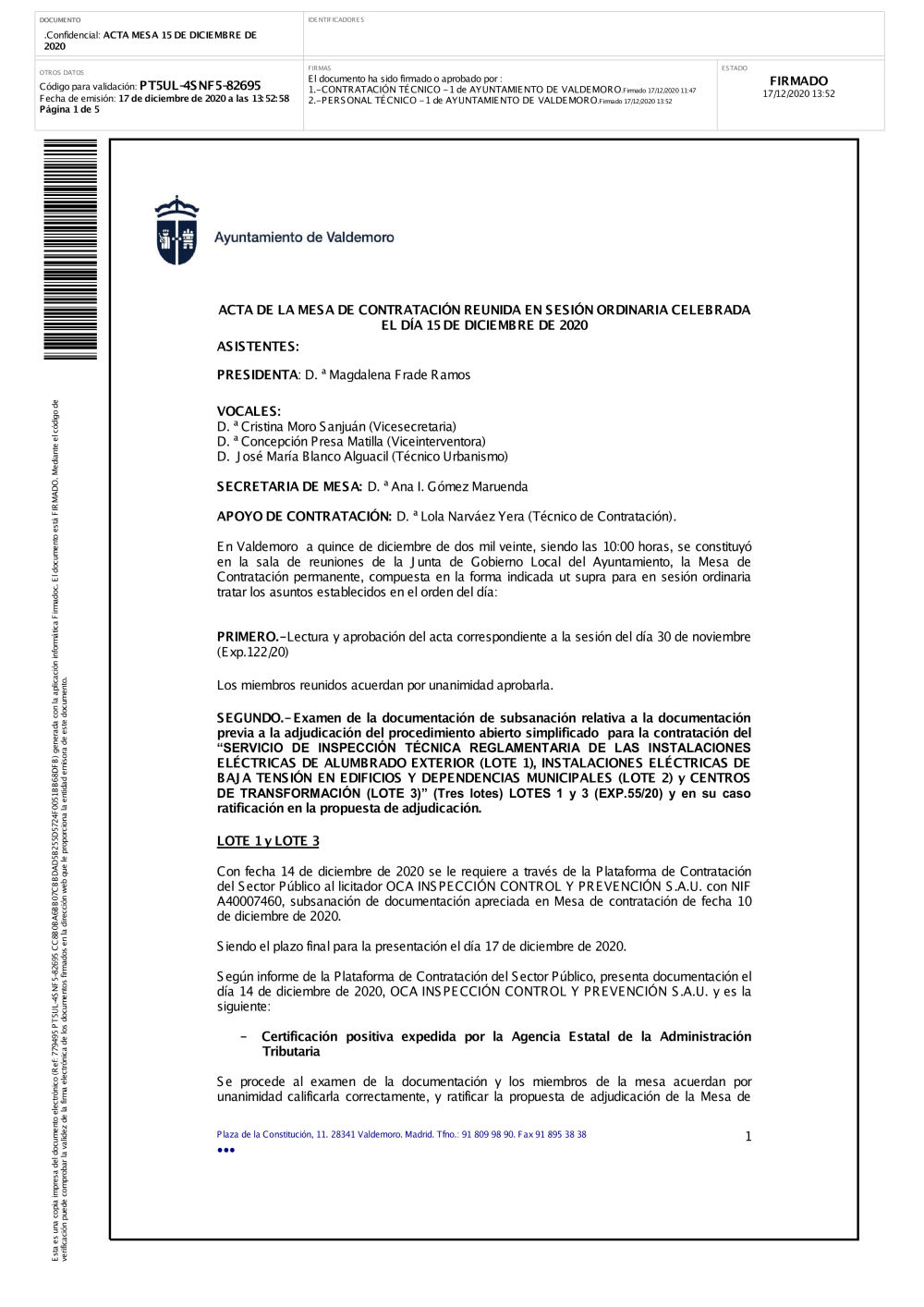 En esta sección puede acceder a los ficheros correspondientes a las actas firmadas de de mesas de contratación del Ayuntamiento de Valdemoro.
