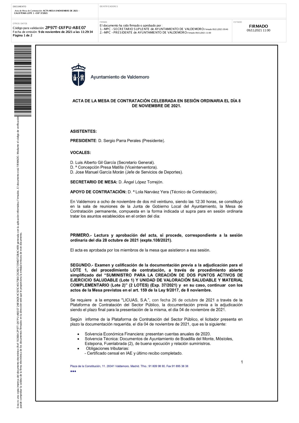 En esta sección puede acceder a los ficheros correspondientes a las actas firmadas de de mesas de contratación del Ayuntamiento de Valdemoro.