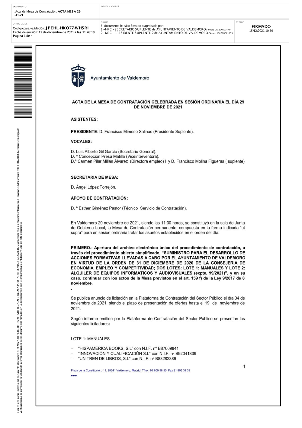 En esta sección puede acceder a los ficheros correspondientes a las actas firmadas de de mesas de contratación del Ayuntamiento de Valdemoro.