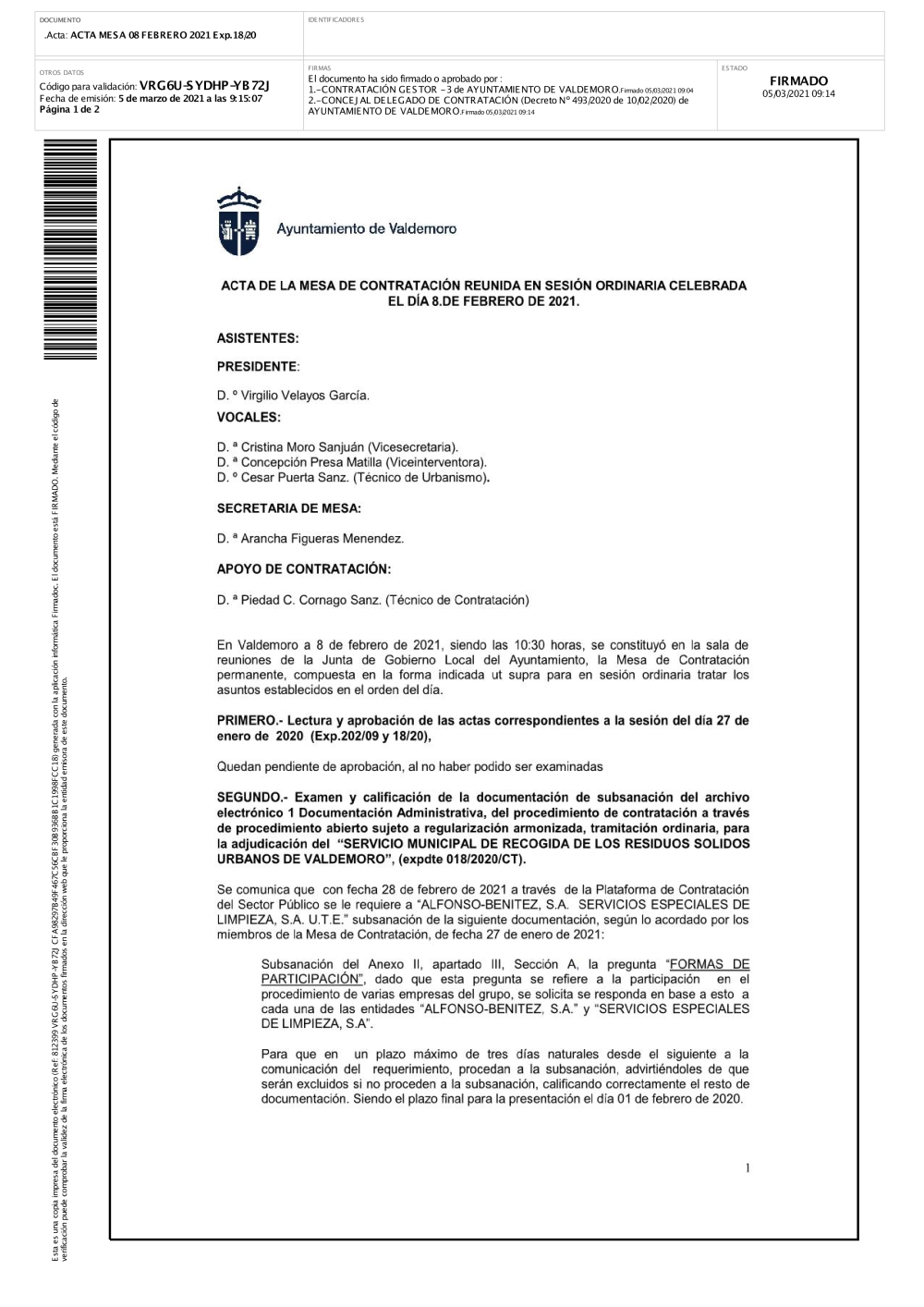En esta sección puede acceder a los ficheros correspondientes a las actas firmadas de de mesas de contratación del Ayuntamiento de Valdemoro.