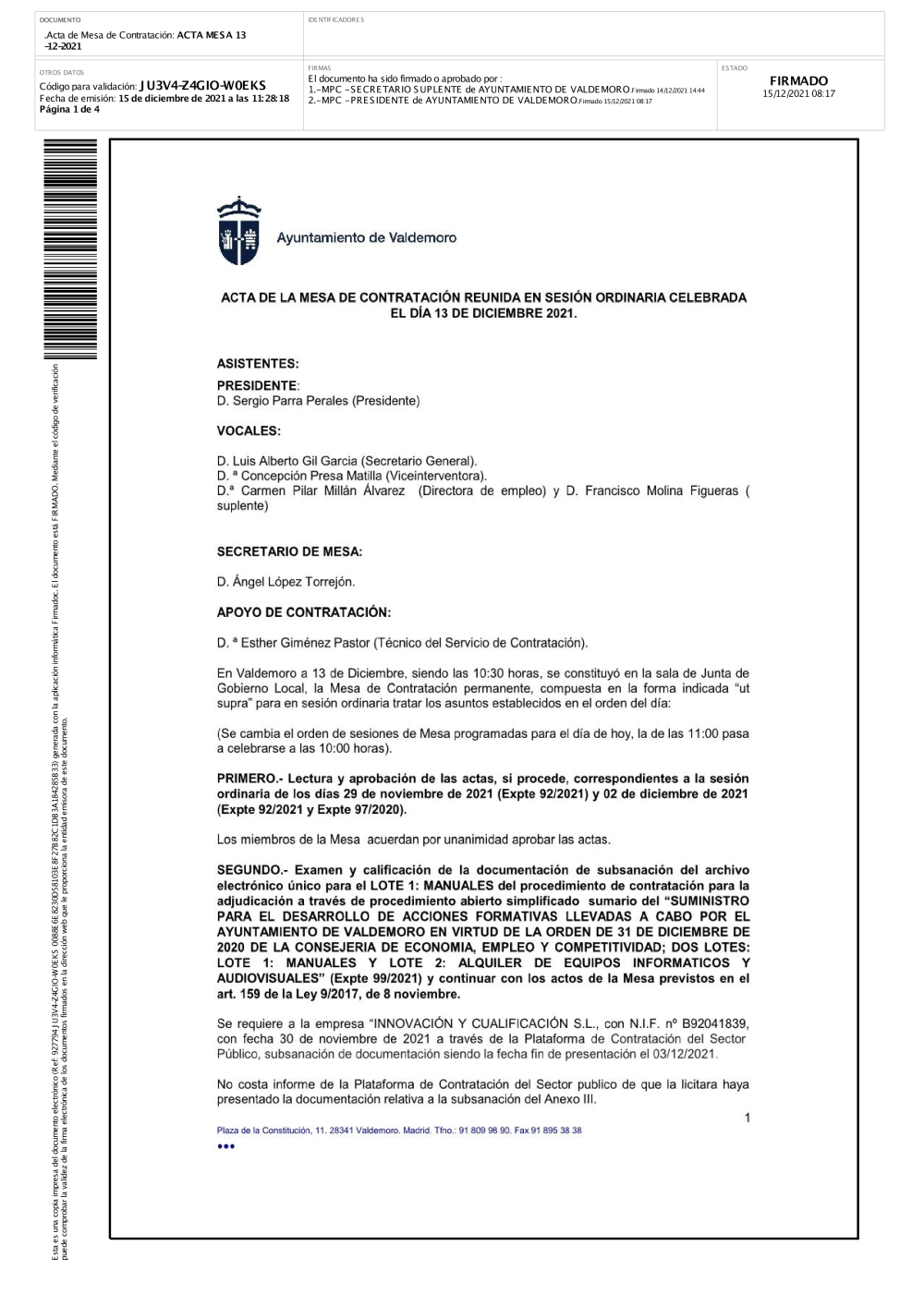 En esta sección puede acceder a los ficheros correspondientes a las actas firmadas de de mesas de contratación del Ayuntamiento de Valdemoro.