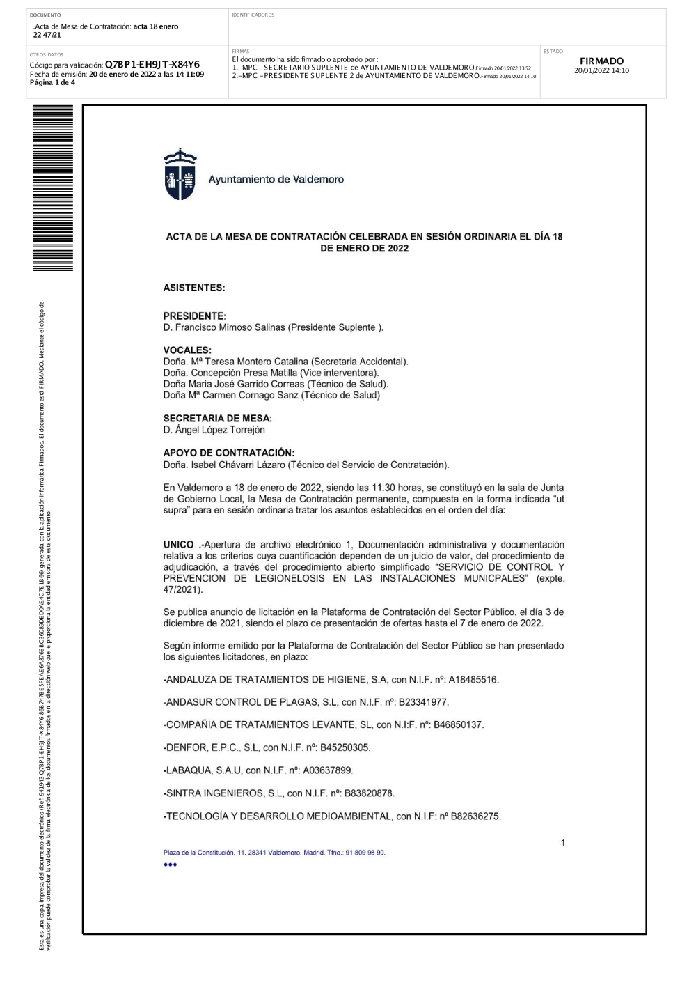 En esta sección puede acceder a los ficheros correspondientes a las actas firmadas de de mesas de contratación del Ayuntamiento de Valdemoro.